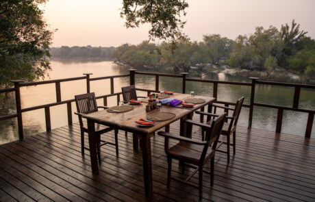 The deck of the lodge’s main lounge area affords stunning views as it leans out over its namesake river.